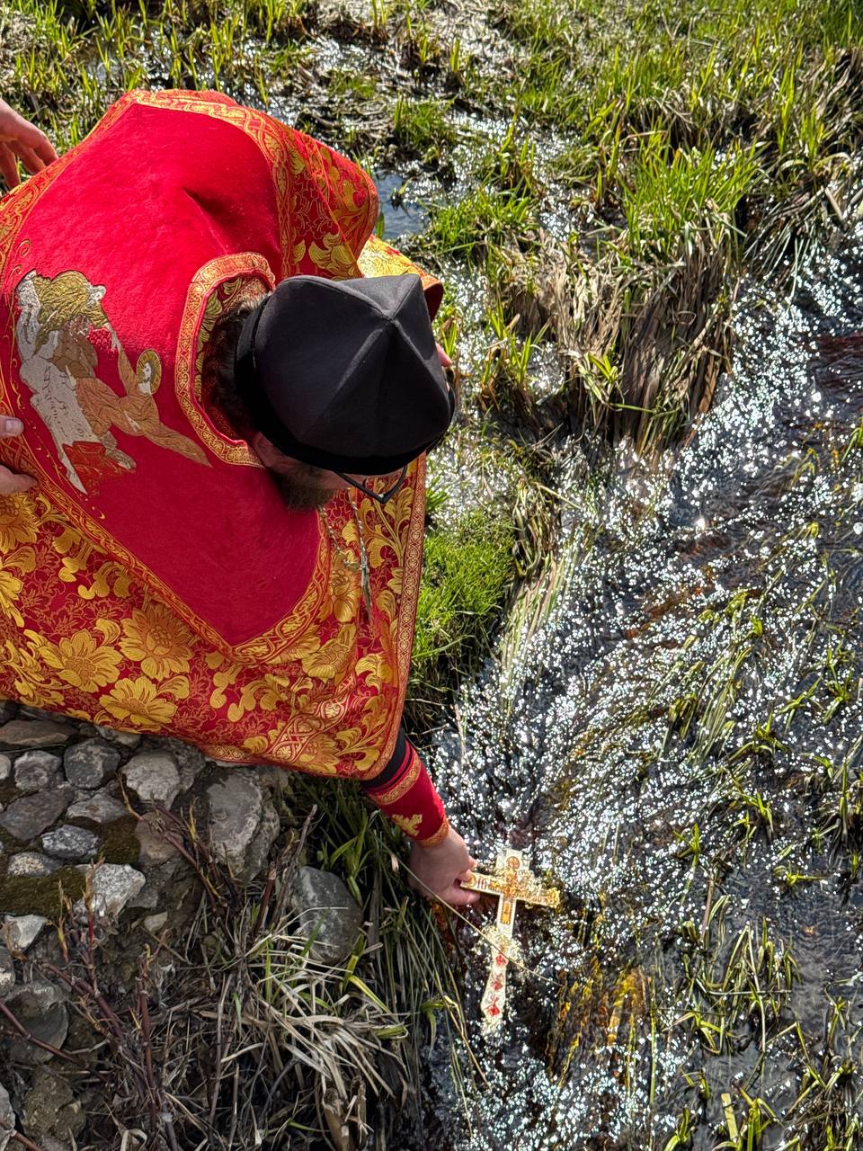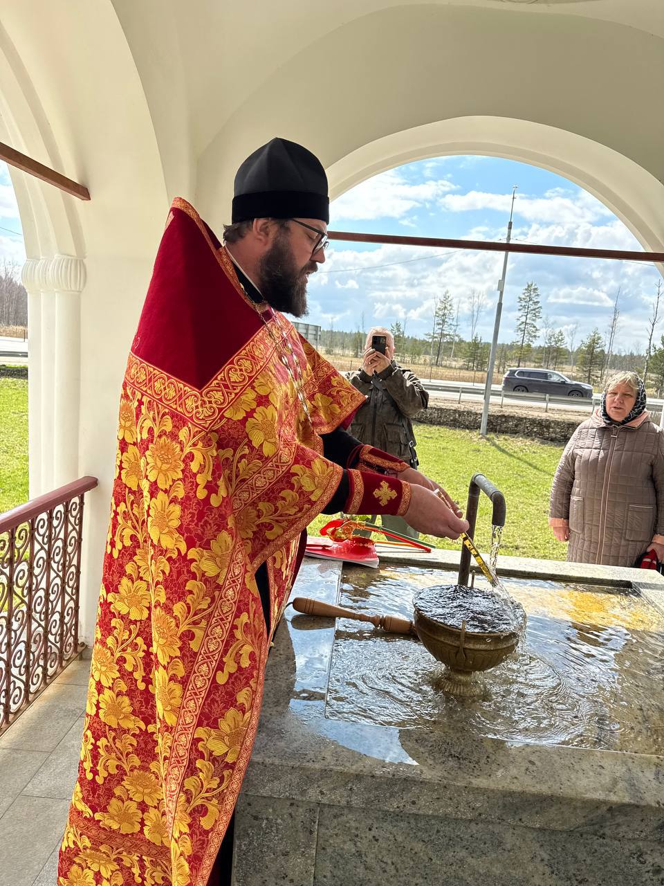 У стен часовни было совершено молебное пение с чином малого освящения воды. Под пение пасхальных тропарей священнослужитель окропил присутствующих и исток реки святой водой.
